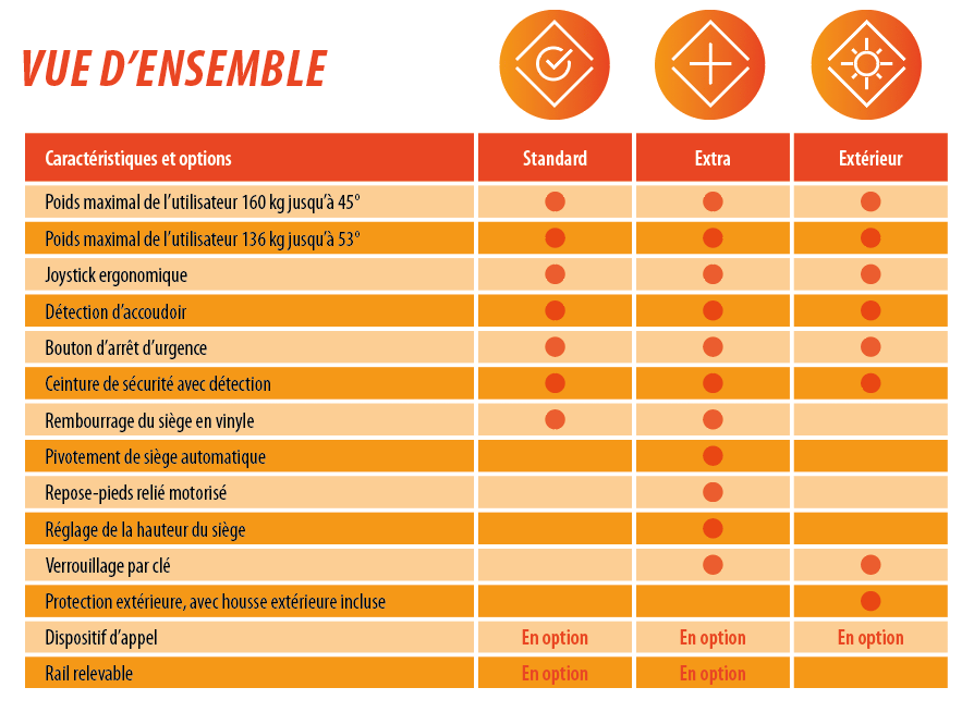 Besoin d’aide pour identifier la plateforme verticale adaptée à votre besoin ? Consultez notre tableau comparatif des fauteuils monte-escaliers PMR